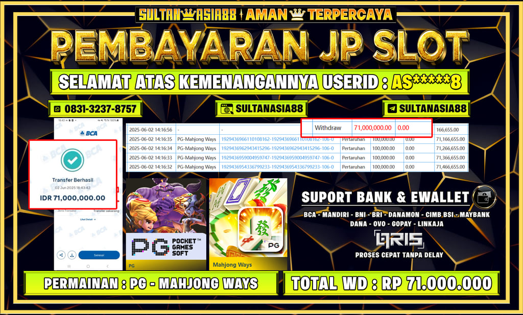 SULTANASIA88 JACKPOT SLOT PG SOFT - MAHJONG WAYS Rp.71.000.000,- LUNAS