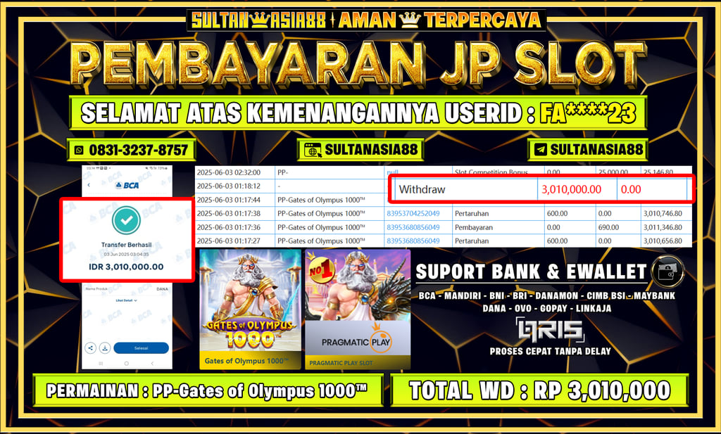 Selamat Kepada Member SULTANASIA88 JP SLOT PP - GATES OF OLYMPUS 1000 User ID FA****23